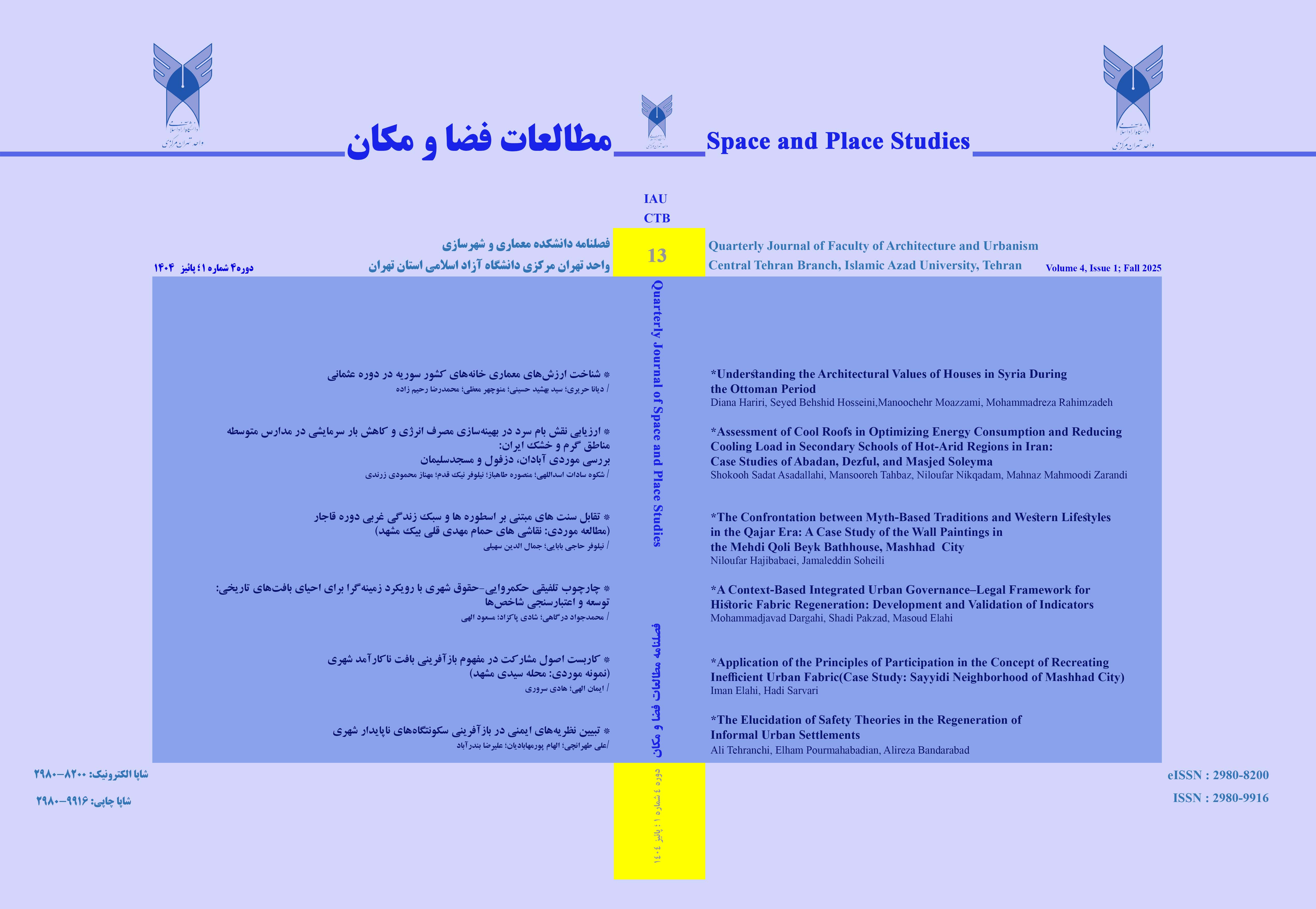 | توضیحات | تعیین عنوان و ارکان بر اساس مصوبه چهارمین جلسه معاونت علوم انسانی وهنر به تاریخ 1398/7/17 دریافت مجوز نشر به شماره 92037 به تاریخ 1401/5/31 از وزارت فرهنگ و ارشاد اسلامی برای نشریه دو زبانی مطالعات فضا و مکان | |